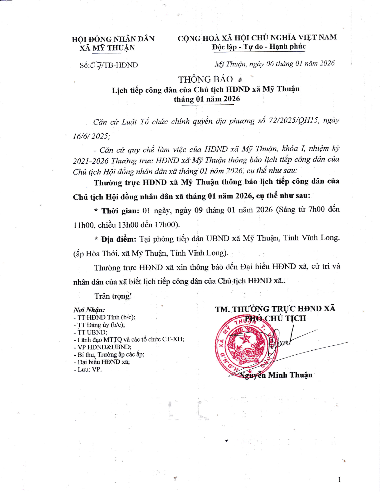Thông Báo lịch tiếp công dân của chủ tịch HĐND xã Mỹ Thuận tháng 01 năm 2026